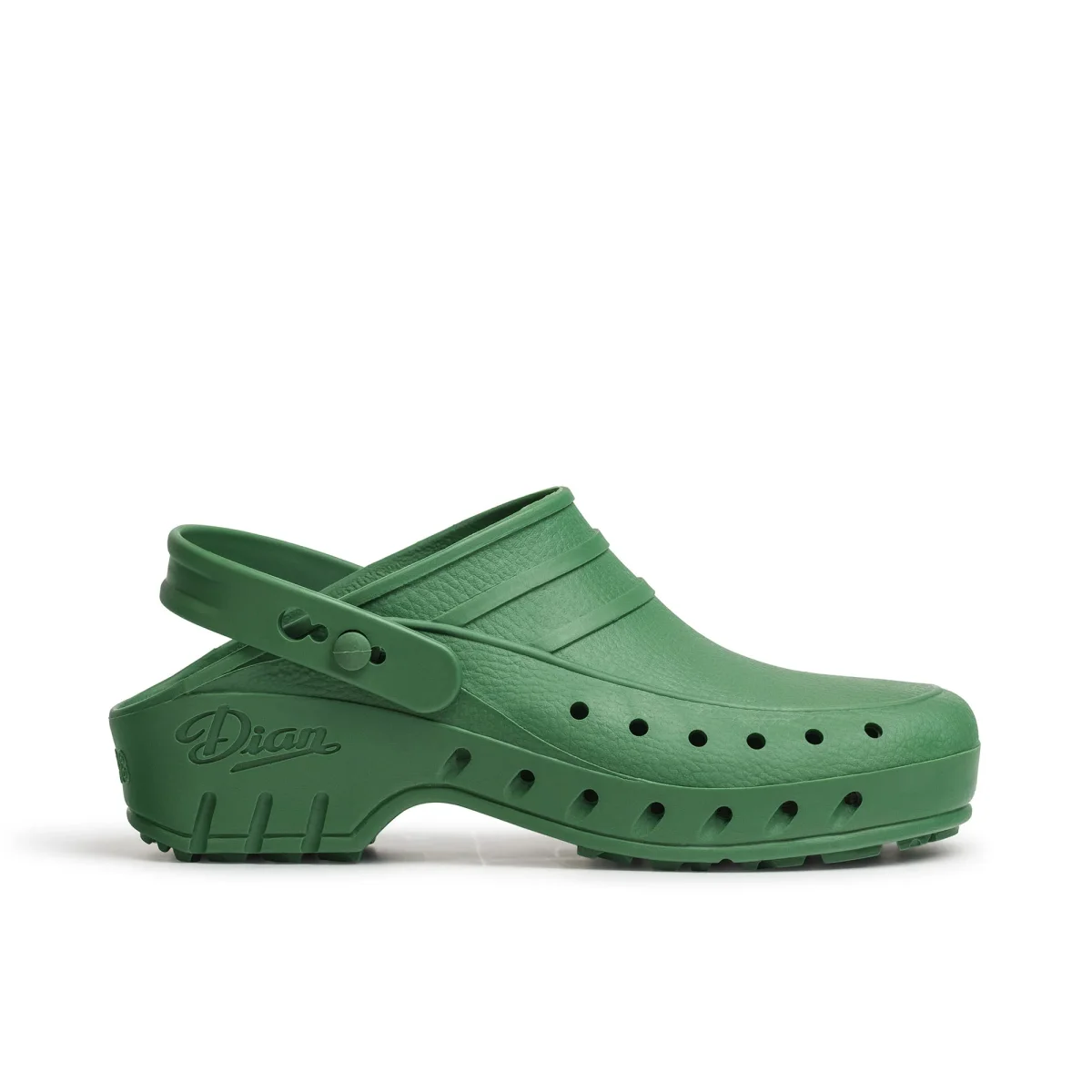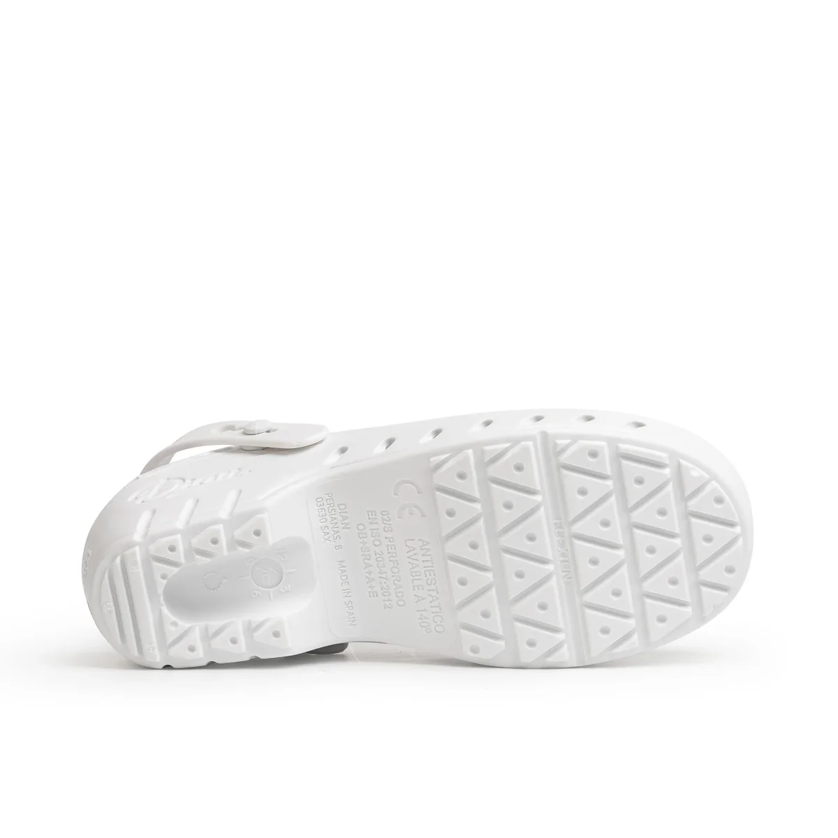 Zueco de material polimérico antibacteriano SBS monocasco, anatómico, antiestático y antideslizante. Apto para lavado en lavadora y esterilizable a 140 ºC y hasta 30 minutos, anatómico con correa posterior abatible entre el talón y la pala, perforado en los laterales para facilitar la transpiración, la limpieza y evitar la penetración directa dentro del calzado de líquidos o fluidos, planta con micropuntos de masaje para estimular la circulación sanguínea. Accesorios: se puede suministrar con plantilla de gel, aparte, para una mejor distribución de las presiones de la planta del pie, la parte inferior de la misma está formada por ventosas que al pisar sobre ellas empujan el aire atrapado en su interior hacia la planta del pie, disminuyendo la transpiración y aumentando el confort.
