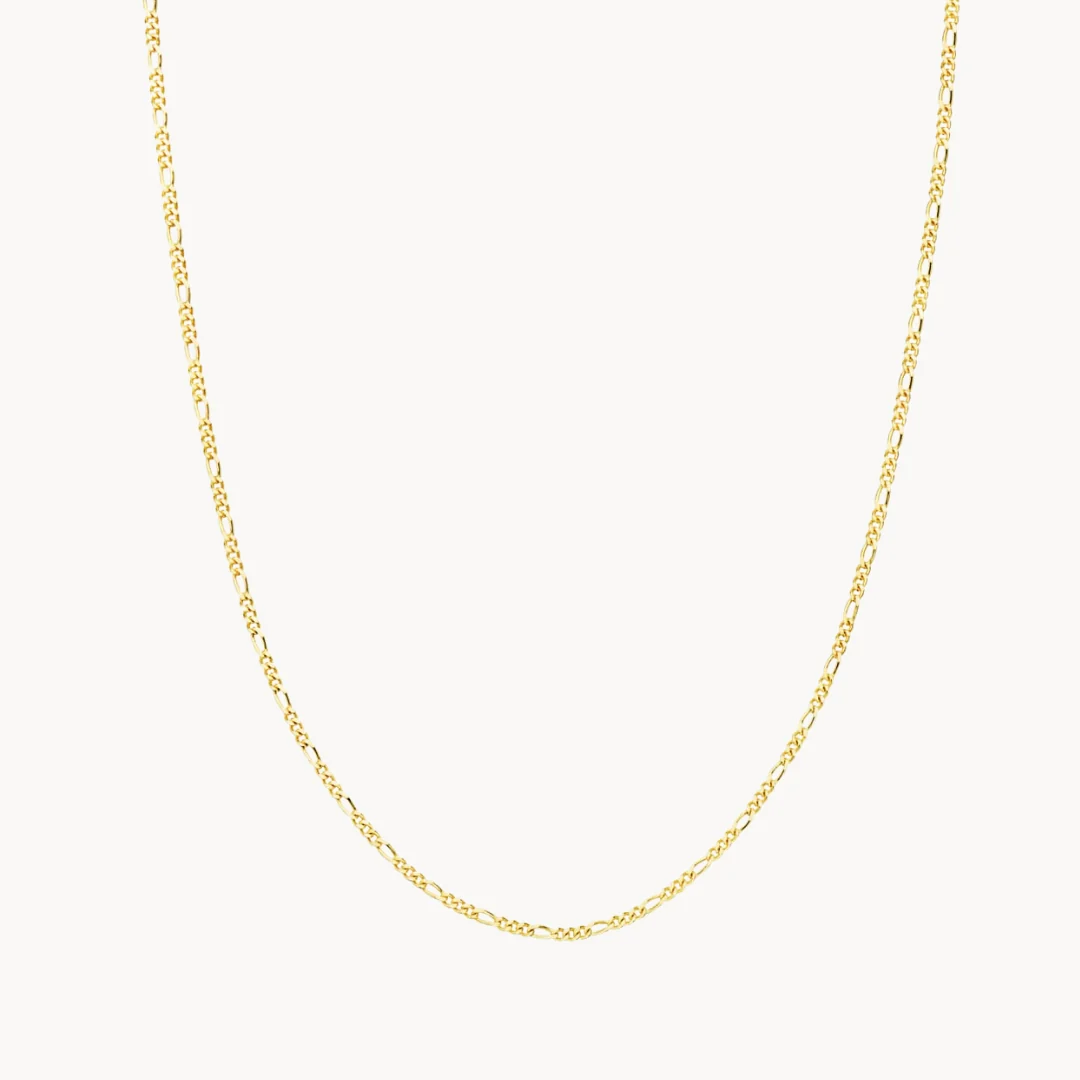 Cadena de oro amarillo de 18 kilates maciza con eslabones tipo fígaro o 3×1, que combina tres eslabones redondos y uno alargado. Largo total de 40cm con un ancho de eslabón de 1mm. Perfecta para llevarla sola o combinándola con un colgante.