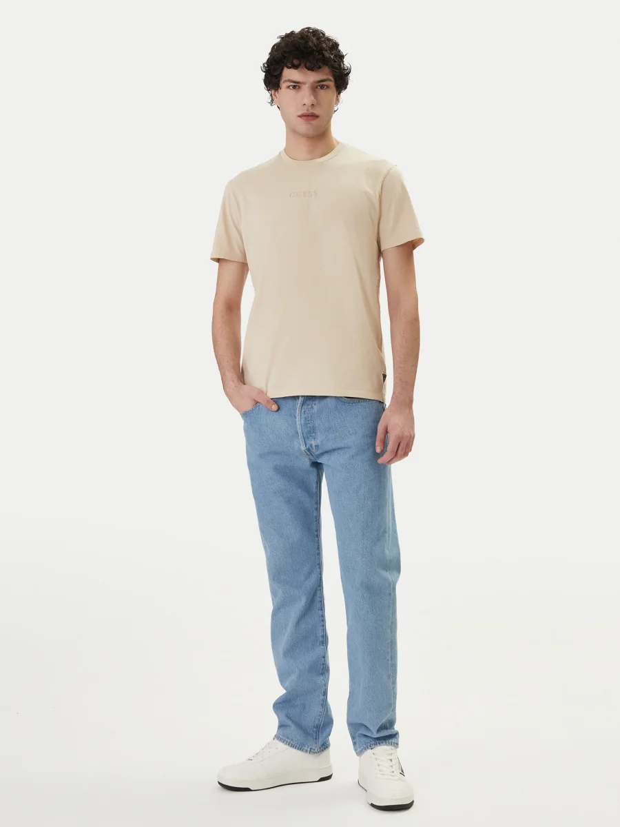 La parte frontal de esta camiseta Guess beige presenta un pequeño logo de la marca en el pecho. Este detalle discreto mantiene una estética limpia y moderna.