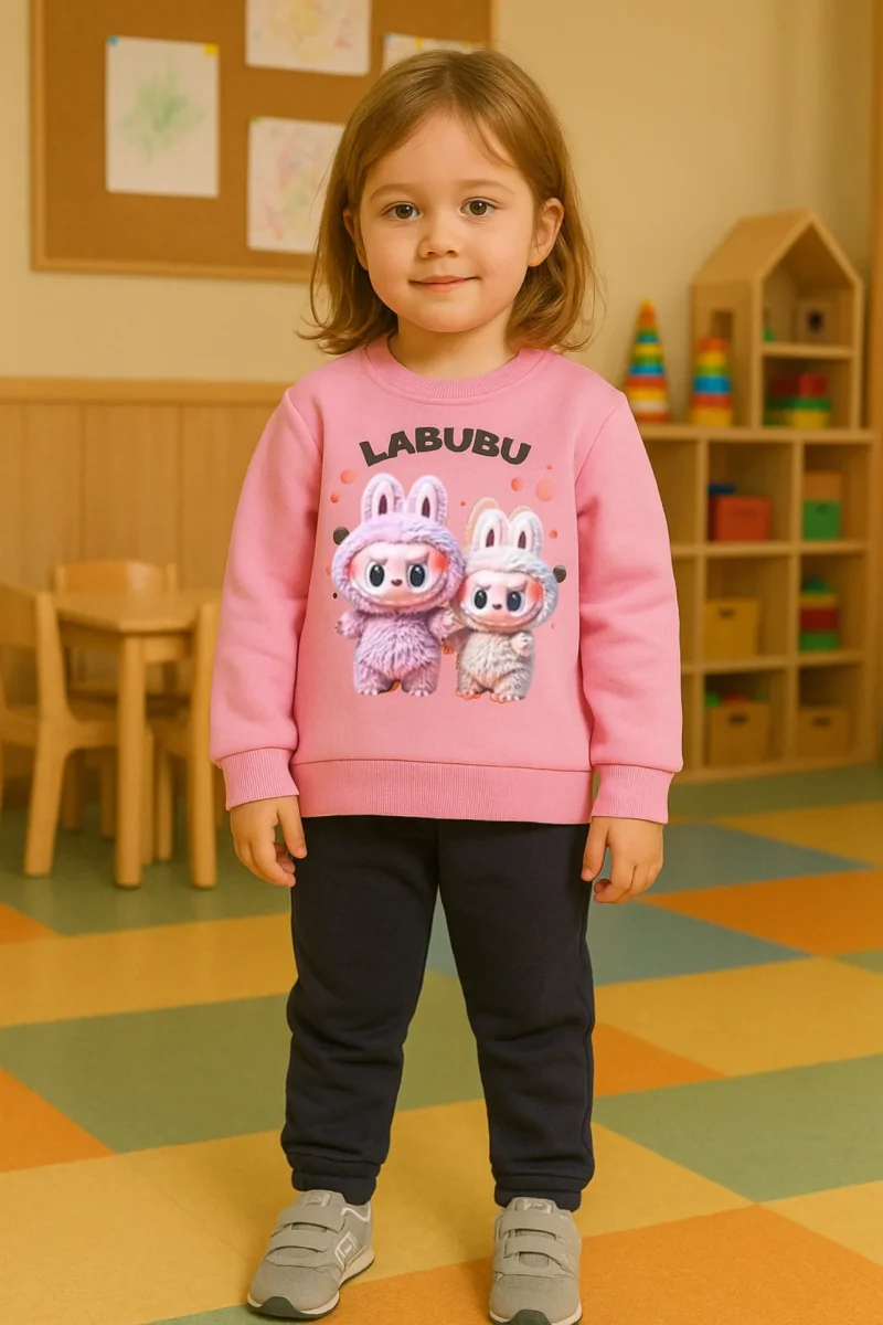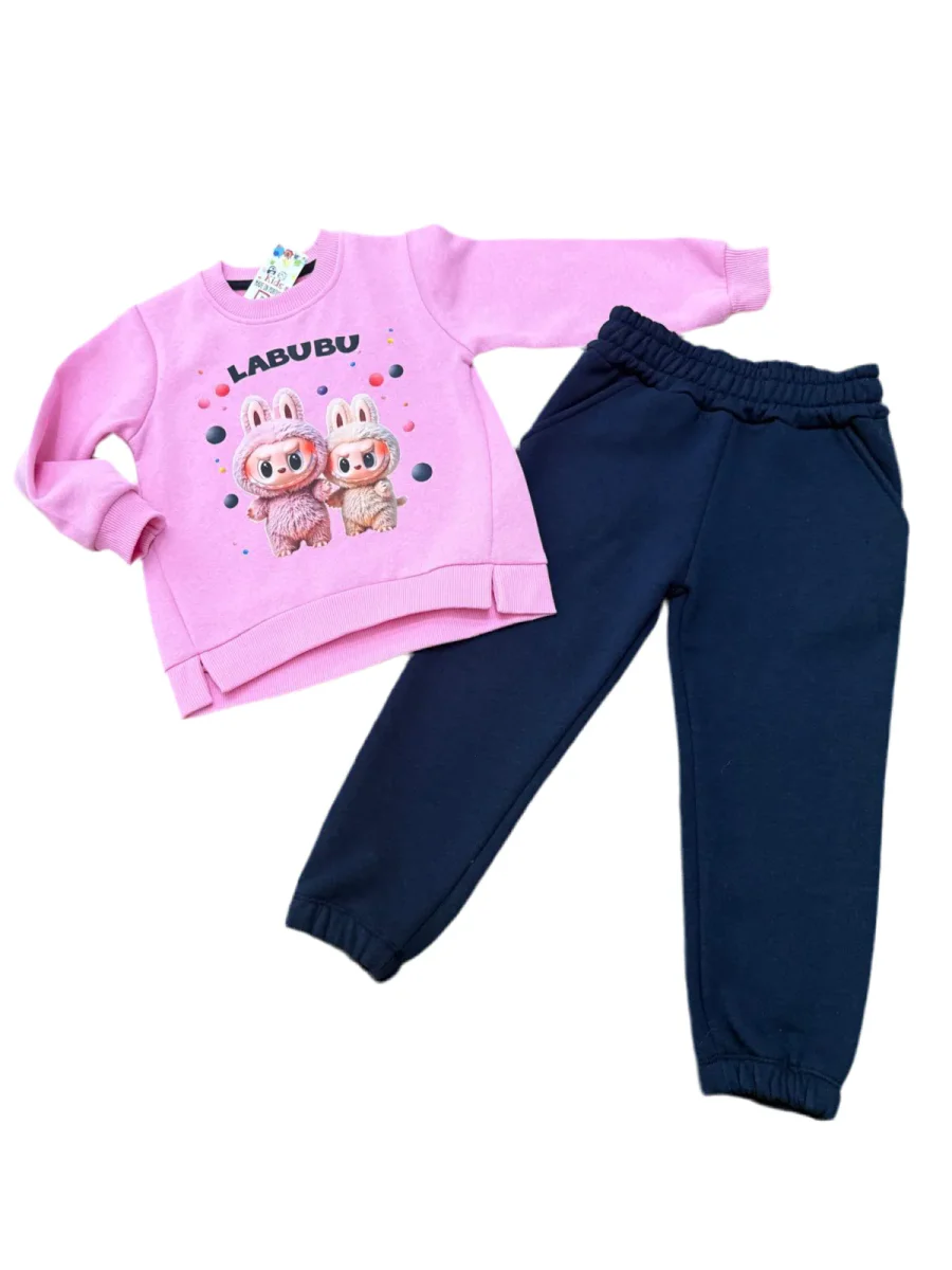 Chandal niña de Labubu, sudadera en rosa de felpa y pantalón azul marino, con bolsillos, puños elásticos..