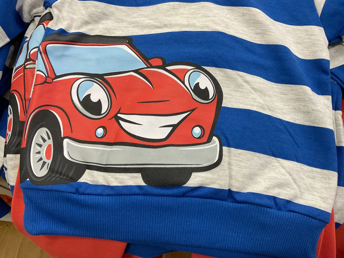 Chándal de dos piezas de niño, la sudadera en rayas en azulón y gris, con un coche naranja, con elásticos en cuello, puños y bajo de las sudadera, con cuello redondo y pantalón en color naranja con puños con elásticos.