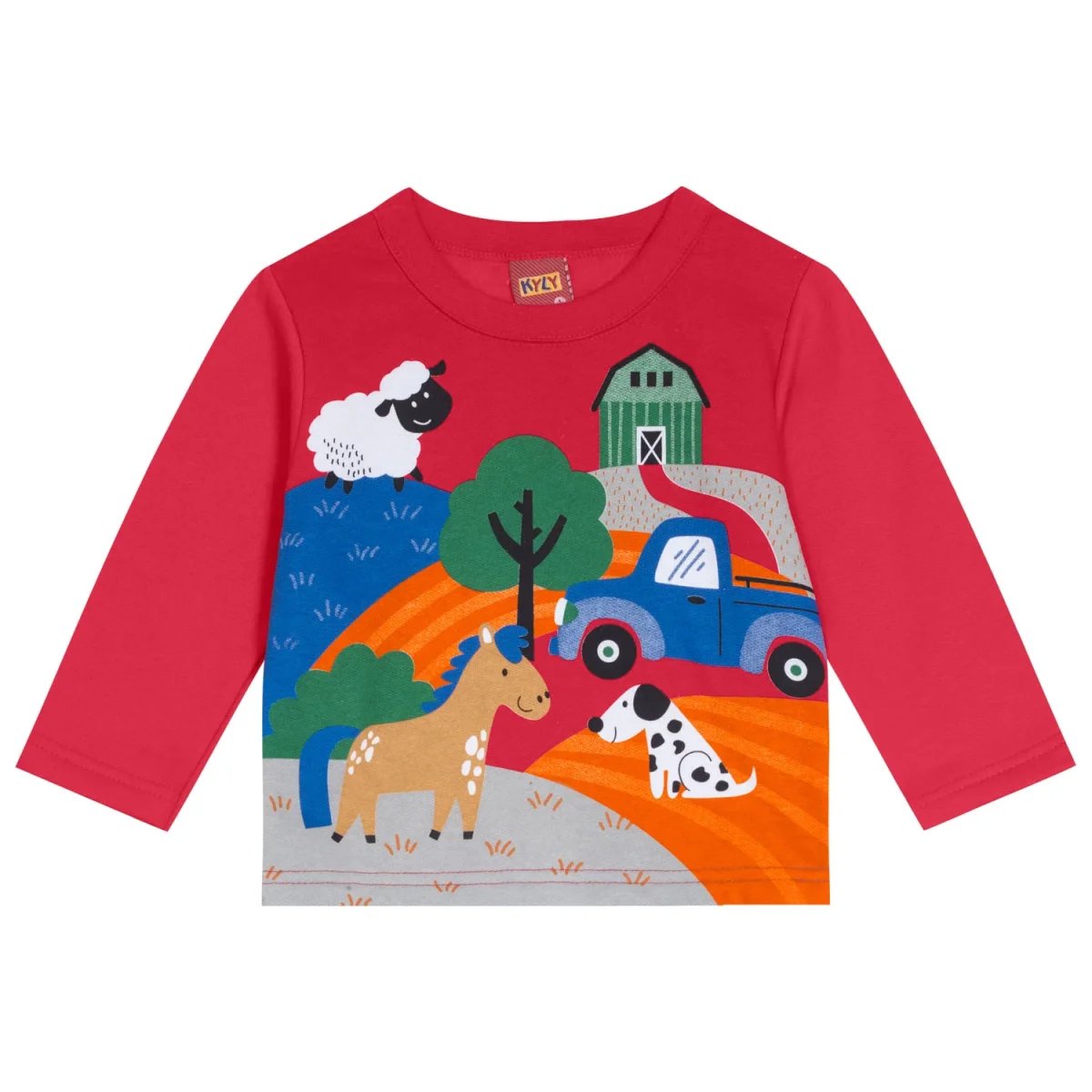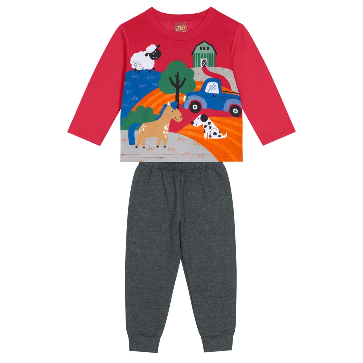 Chándal de dos piezas de niño en color rojo con dibujos estampados, con pantalón en gris oscuro.