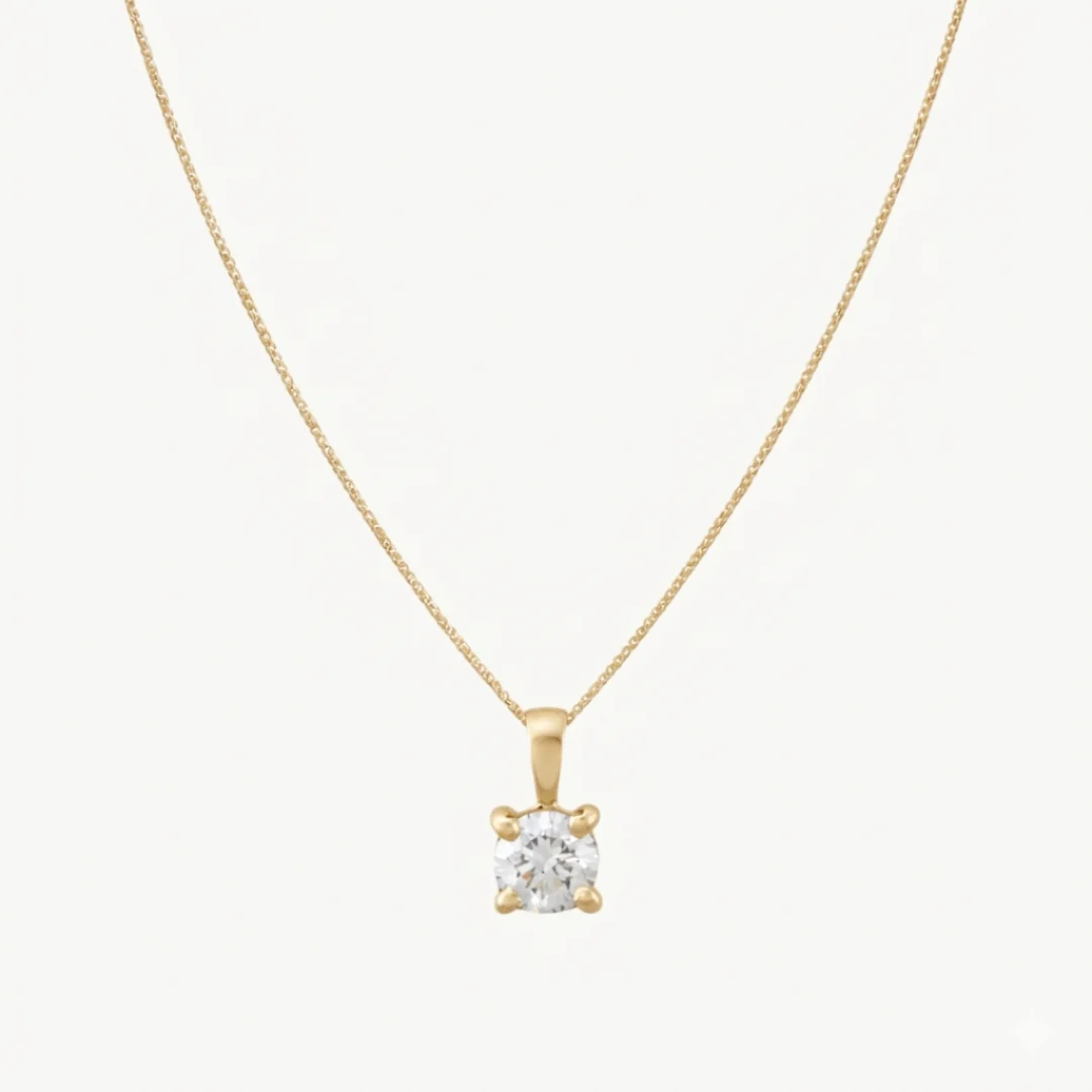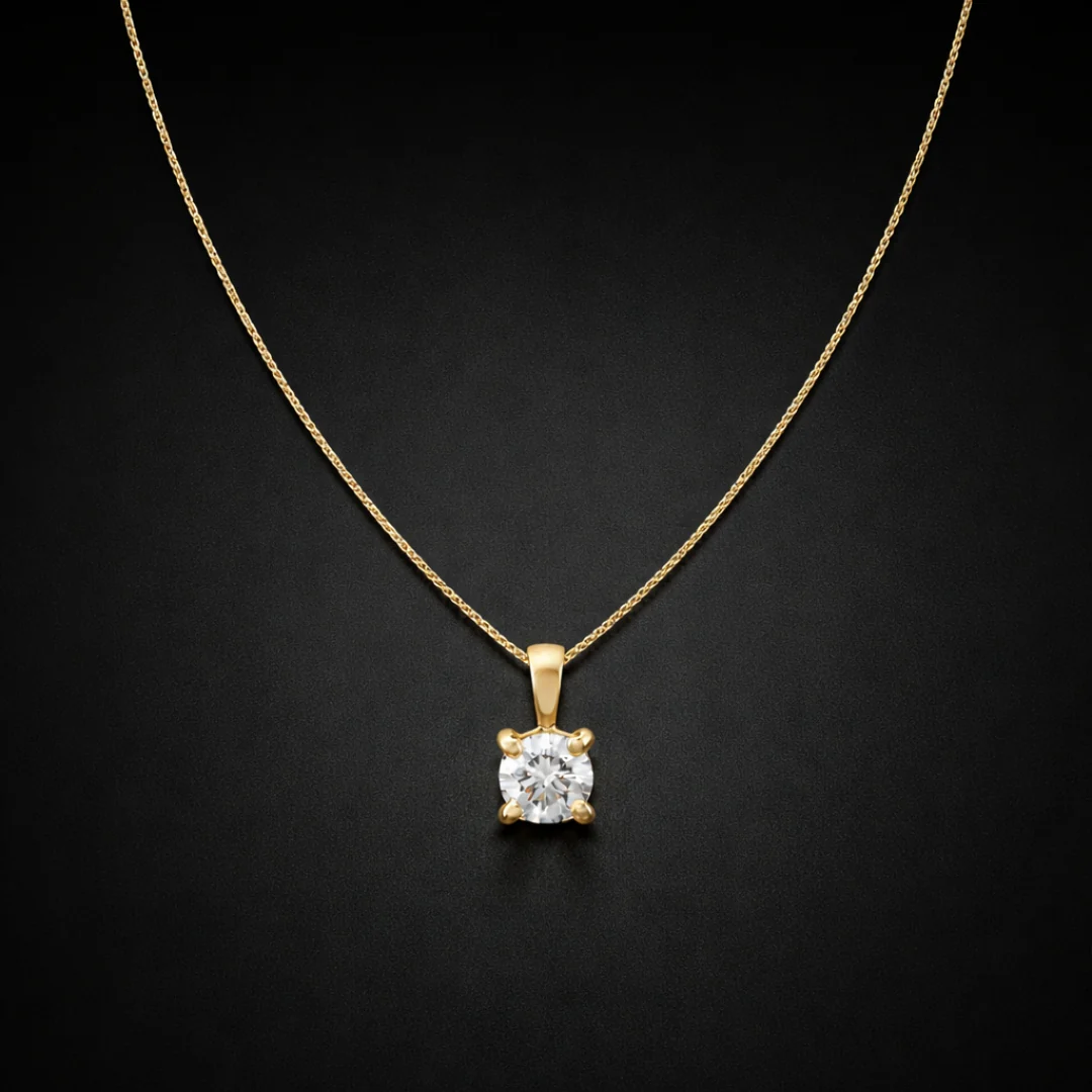 Cadena y colgante de oro amarillo de 18 kilates con un diamante natural certificado por I.G.I de 0.30 quilates en engastado en cuatro garras. Con este colgante se adjunta un certificado I.G.I que acredita la pureza, color, talla y peso de los diamantes.