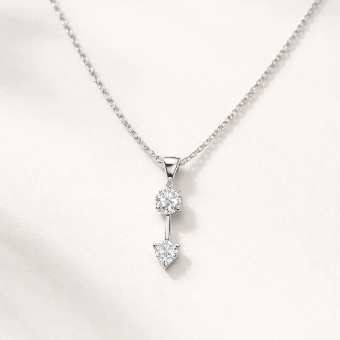 Cadena y colgante de oro blanco de 18 kilates con dos diamantes naturales en talla brillante de 0.080 quilates en total engastados uno en tres garras y otro en cuatro garras. Con este colgante se adjunta un certificado que acredita la pureza, color, talla y peso de los diamantes.