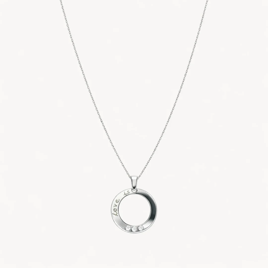 Cadena y colgante de oro blanco de 18 kilates con disco con frase de «Love is» y tres diamantes engastados en el disco de 0.015 quilates. Con este colgante se adjunta un certificado que acredita la pureza, color, talla y peso de los diamantes.