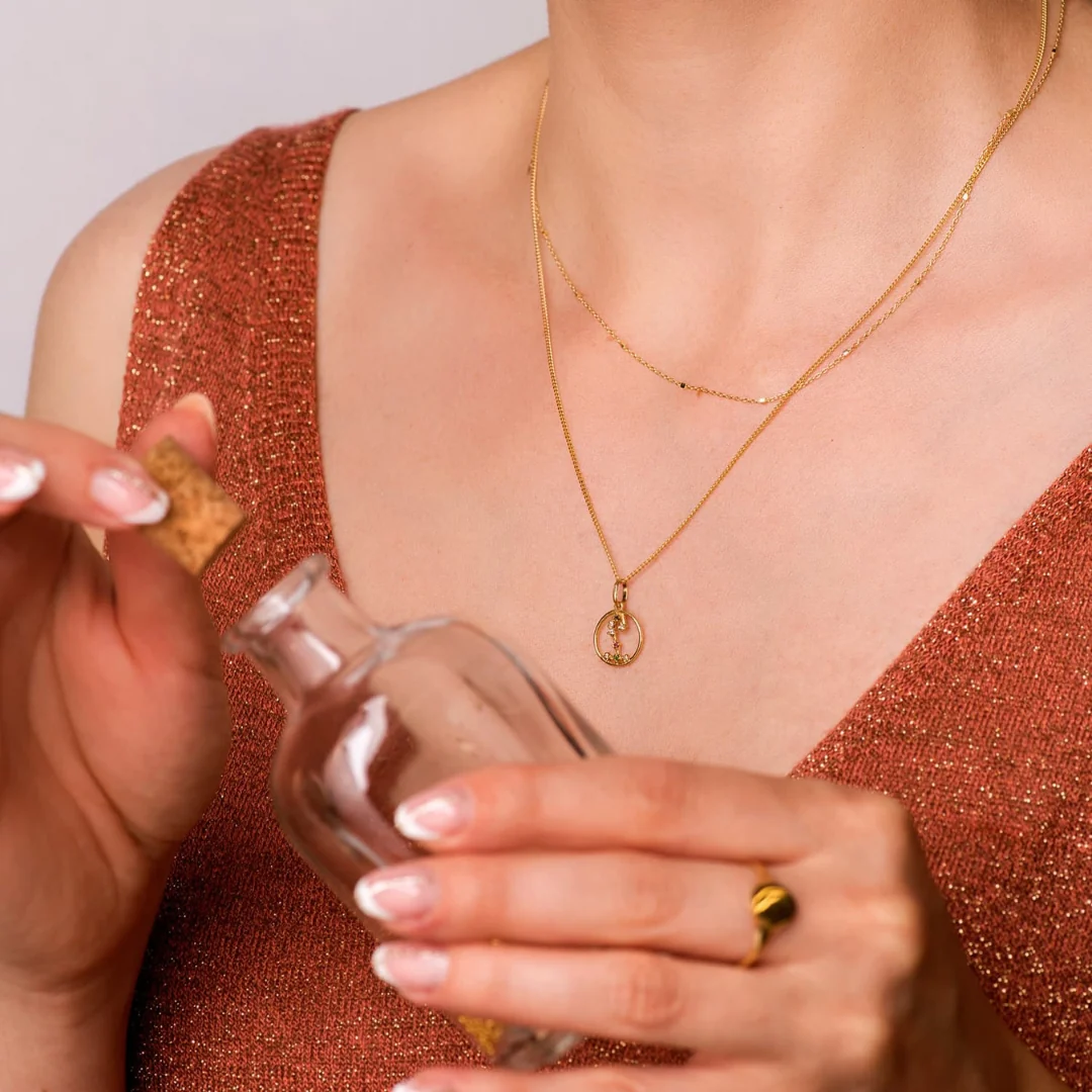 Cadena y colgante de oro amarillo de 18 kilates con constelación de horóscopo Escorpio y ocho circonitas de color en talla brillante engastadas en cuatro garras.