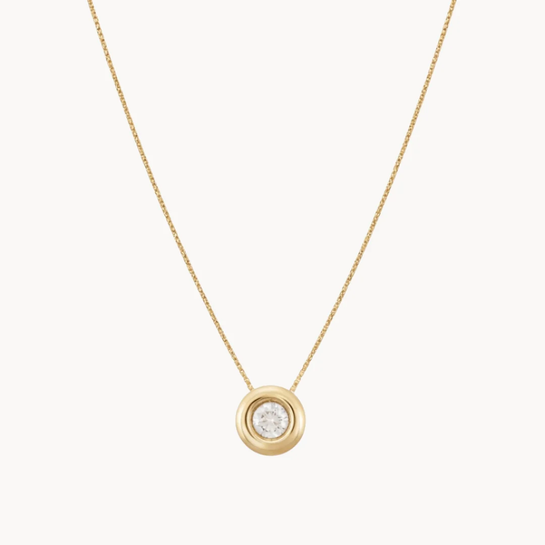 Cadena y colgante de oro amarillo de 18 kilates con un diamante natural en talla brillante de 0.20 quilates engastado en chatón. Con este colgante se adjunta un certificado que acredita la pureza, color, talla y peso del diamante.