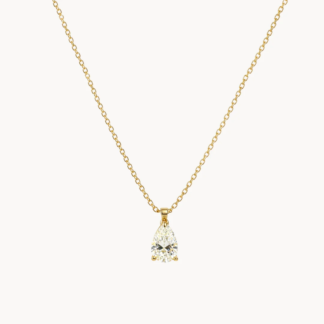 Cadena y colgante de oro amarillo de 18 kilates con un diamante creado en laboratorio certificado por I.G.I de 0.55 quilates en talla perilla engastado en tres garras. Con este colgante se adjunta un certificado I.G.I que acredita la pureza, color, talla y peso de los diamantes.