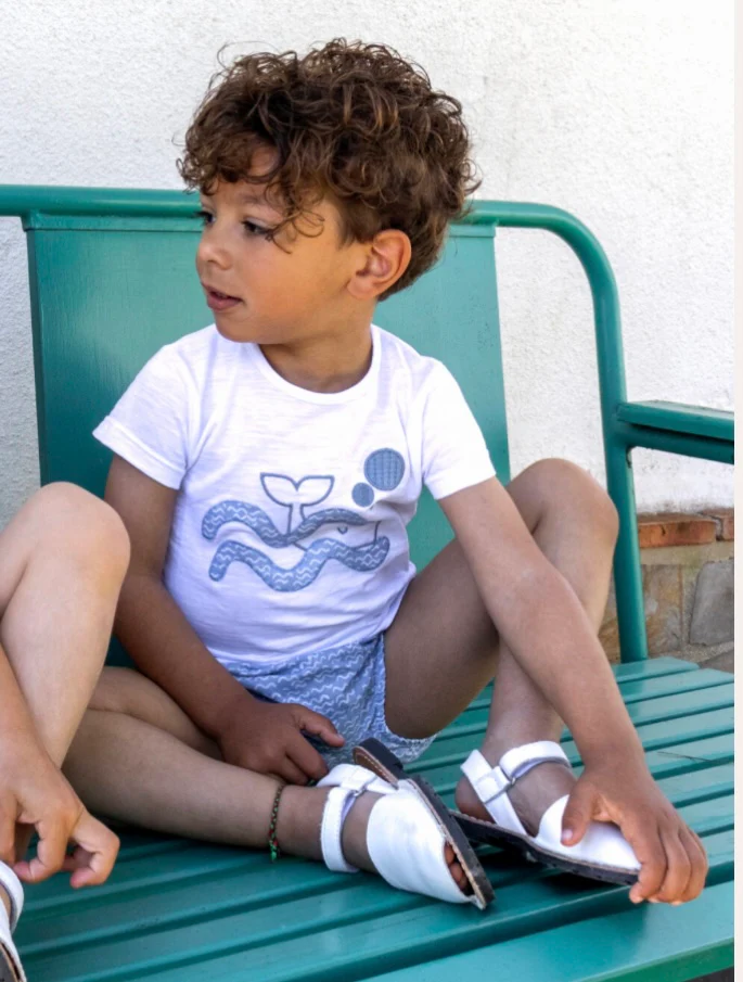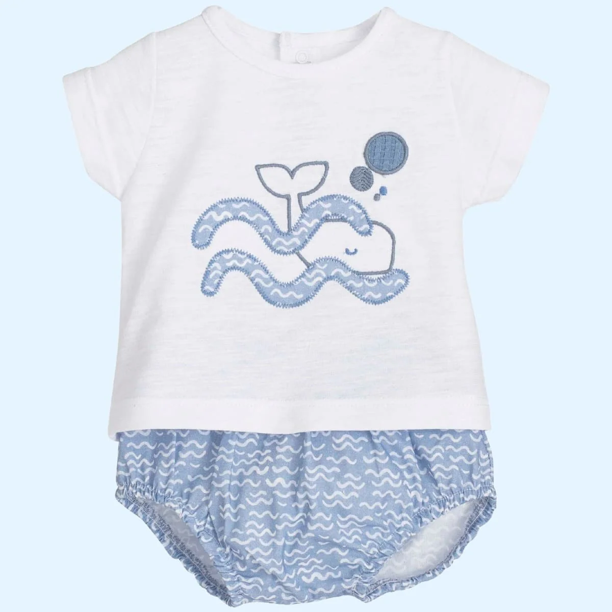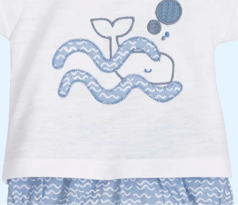 Presenta un bordado de gran tamaño que muestra una ballena y burbujas en color azul. El diseño utiliza diferentes texturas de puntada para representar las olas y el cuerpo del animal. Dispone de botones de presión en la parte posterior del cuello para facilitar el cambio de ropa.