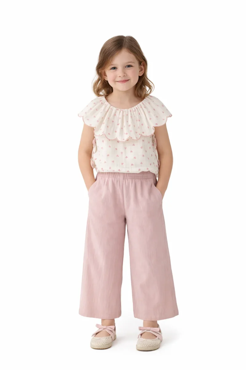 • Blusa: Confeccionada en un tejido ligero tipo muselina de color crema con un delicado estampado de mini corazones en color rosa empolvado. Destaca su gran cuello volante festoneado y los detalles de lazos laterales.