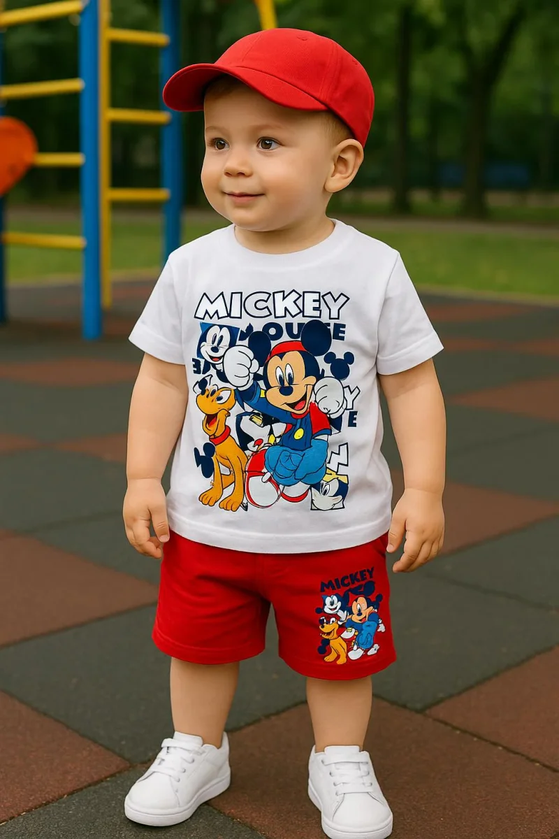 Conjunto de niño, camiseta blanca, con manga corta y cuello redondo y estampación en Dtf con los personajes de Disney y bermuda de algodón en color rojo, cordón ajustable, con bolsillos y elástico en la cintura, con Dtf de Micky Mouse en una pierna, un precioso conjunto que enamora a cualquiera niño 💙