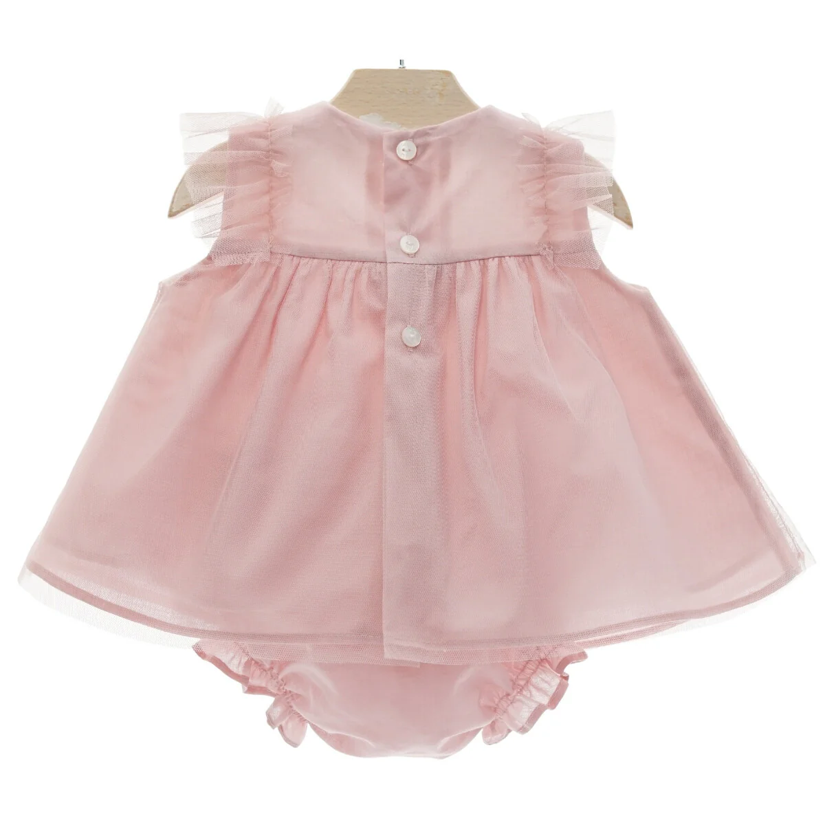 Jesusito de bebé niña, vestido sin mangas, cuello redondo, talle alto, cuerpo en blanco y dispone de volante en los hombros y la parte de la falda en tul color maquillaje que le da un toque muy bonito y cubre pañal en rosa. Abotonado por detras