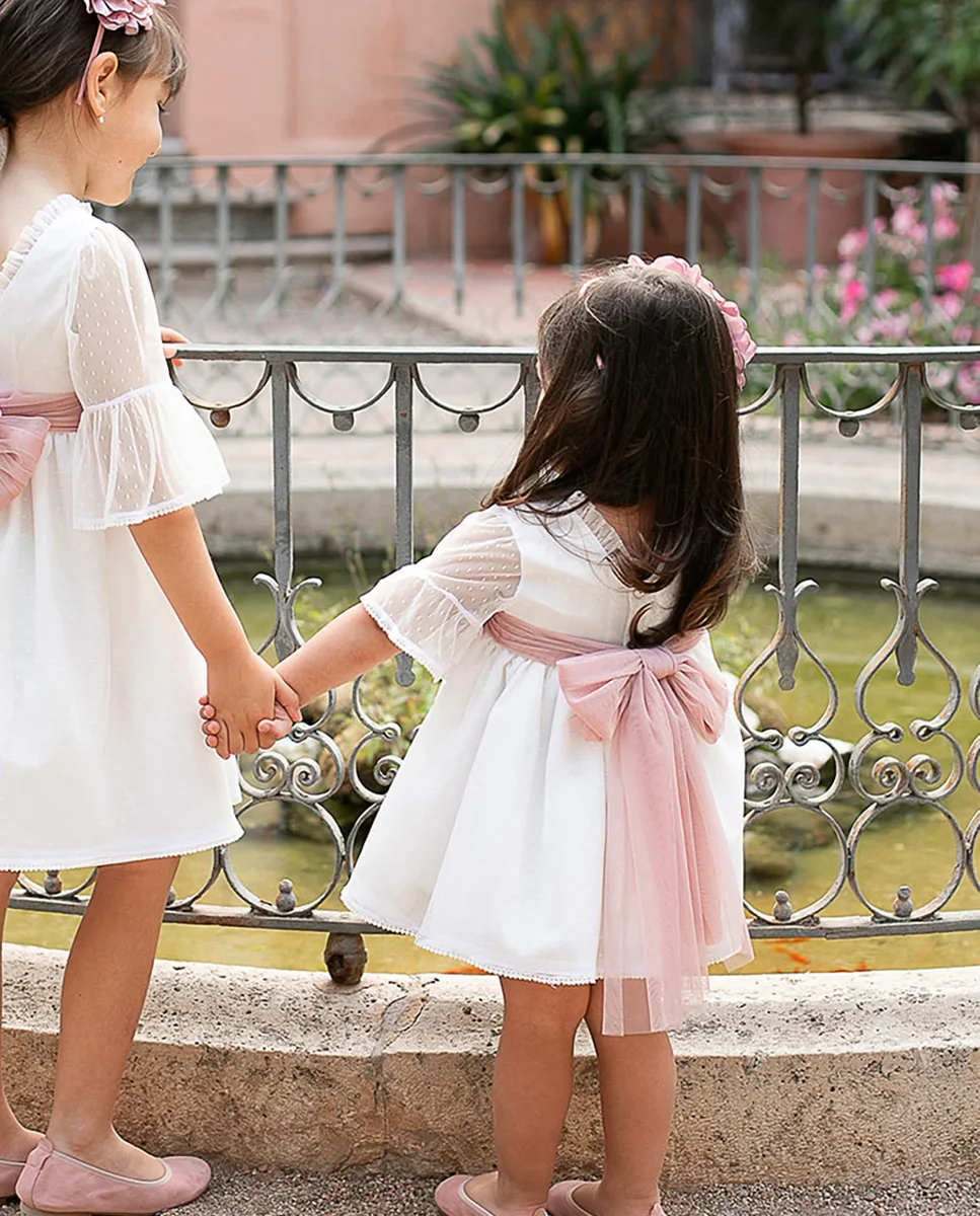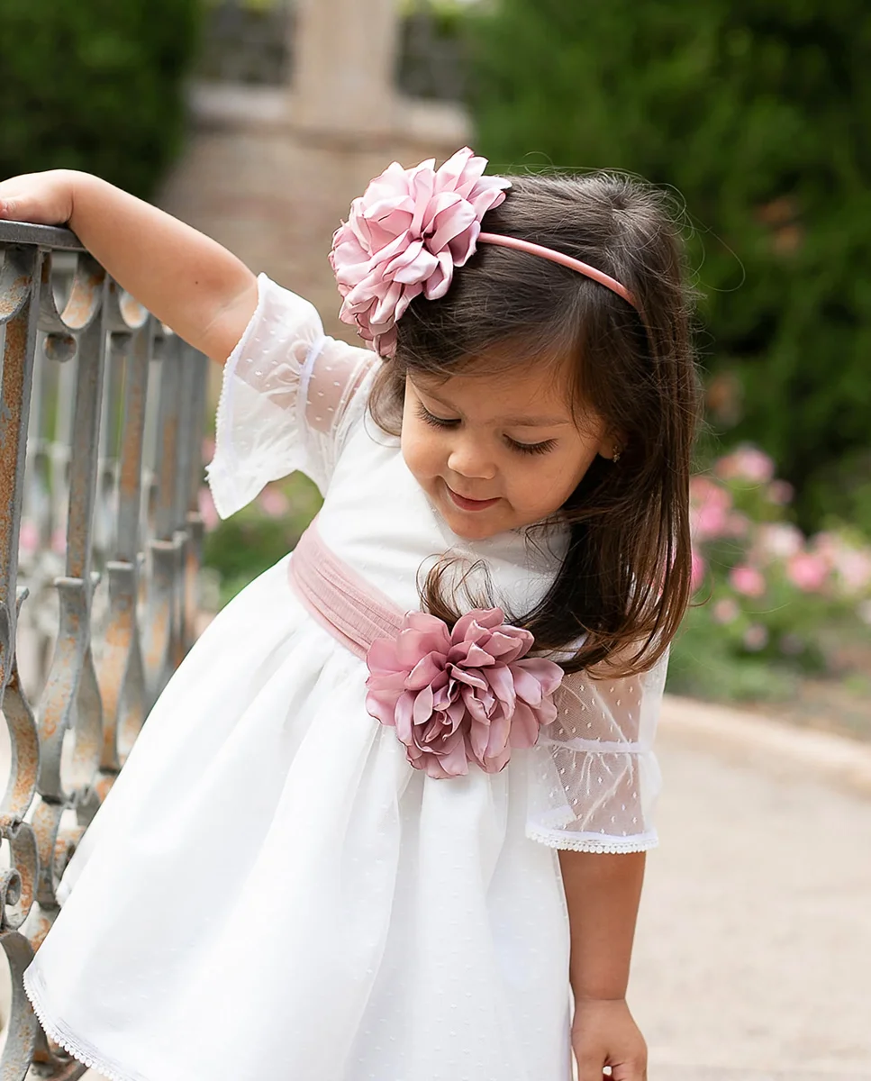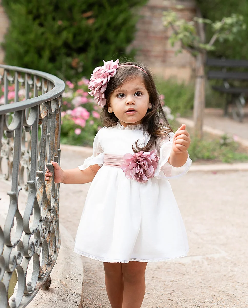 Precioso Jesusito de niña, confeccionado de tejido de tul en color blanco, cuello redondo con un volantito en el filo, manga francesa con volante que le da un toque muy elegante y delicado, espalda con escote en V, abotonado por detrás y lazo de tul en rosa empolvado y braguita de tul forrada de tejido de algodón. No incluye las flores.