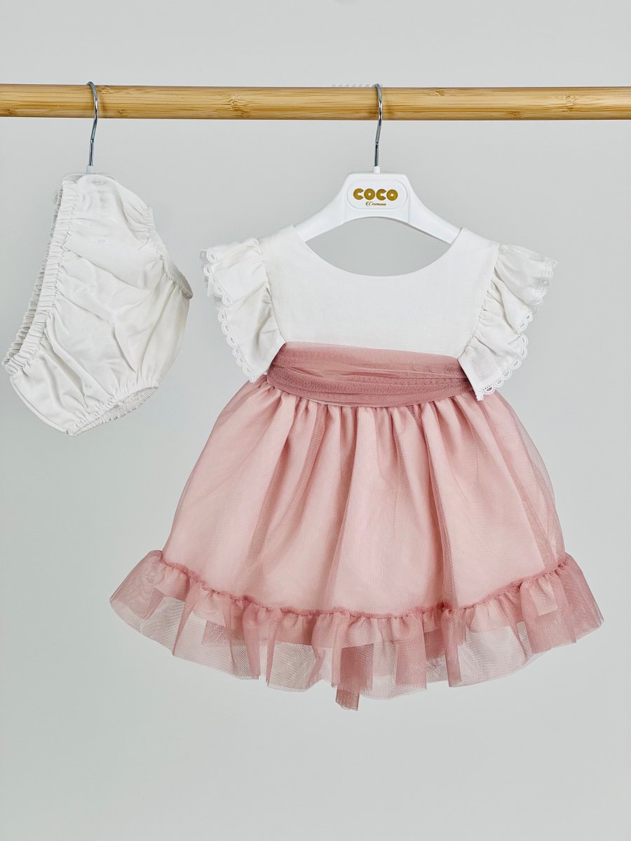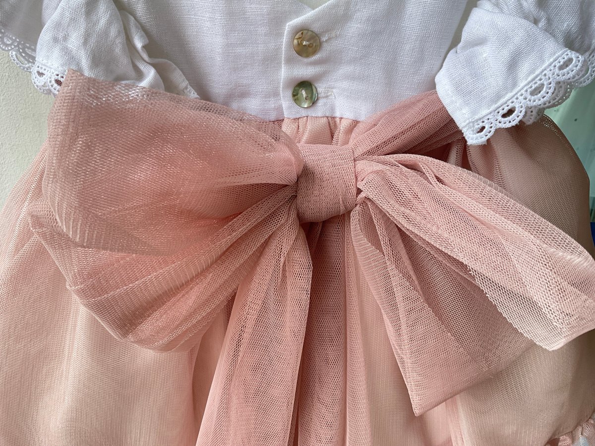 Jesusito de niña de ceremonia, cuerpo de lino en blanco roto, cuello redondo por delante y pico por detrás, volante en sisa y puntilla en el filo del volante, falda de tul en rosa y volante en el bajo del mismo tono y cinturón de tul terminado en lazada en la espalda y cubre pañal en blanco.