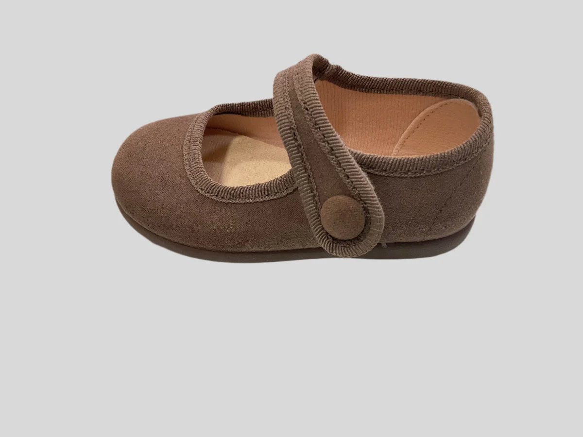 Merceditas niña en color taupe de serratex, son muy cómodas, Ideal para tallas pequeñas. Es un salon de correa fina adherente y boton de adorno