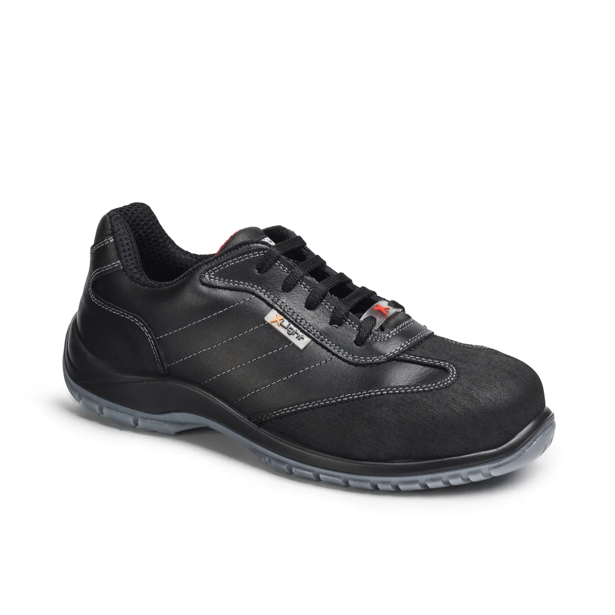 Zapato con puntera de seguridad y plantilla antiperforación, no metálicas, con cierre por cordones, lavable en frío, pala de piel forrada interiormente, áltamente TRANSPIRABLE con gran capacidad de absorción de humedad y rápido secado. Horma recta de puntera redondeada. Contrafuerte de dureza suficiente para sujetar el calcáneo. Plantilla de tejido sobre espuma de poliuretano con tratamiento antibacterias y carbón activado. Suela de poliuretano antideslizante de gran coeficiente en seco y húmedo, con resaltes acanalados en la suela para facilitar la evacuación de líquidos.