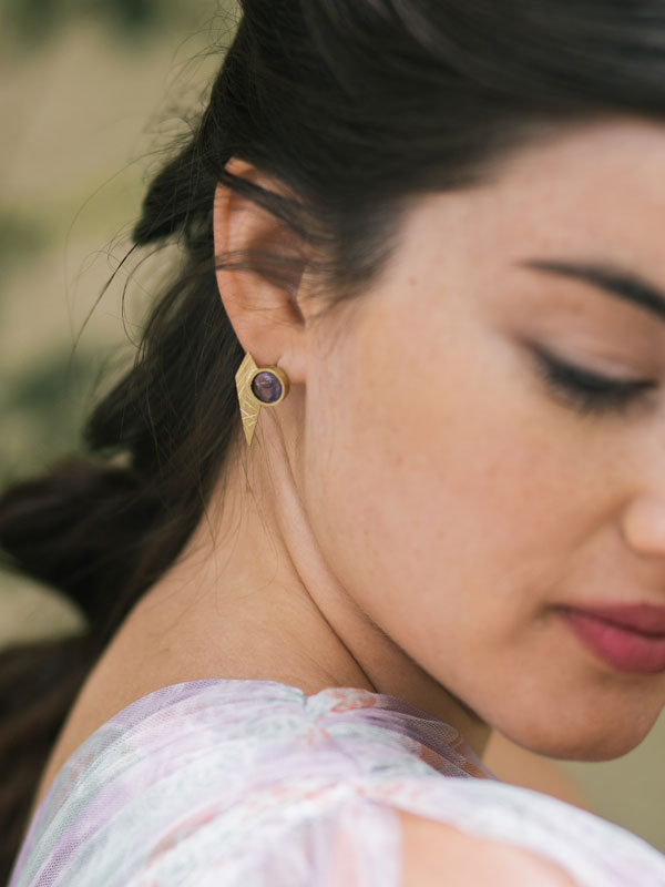 Pendientes cortos con baño en oro de nuestra colección heroica con piedra natural rodonita rosa. Disponible en otros colores / piedras naturales aquí. Disponible también en plata.