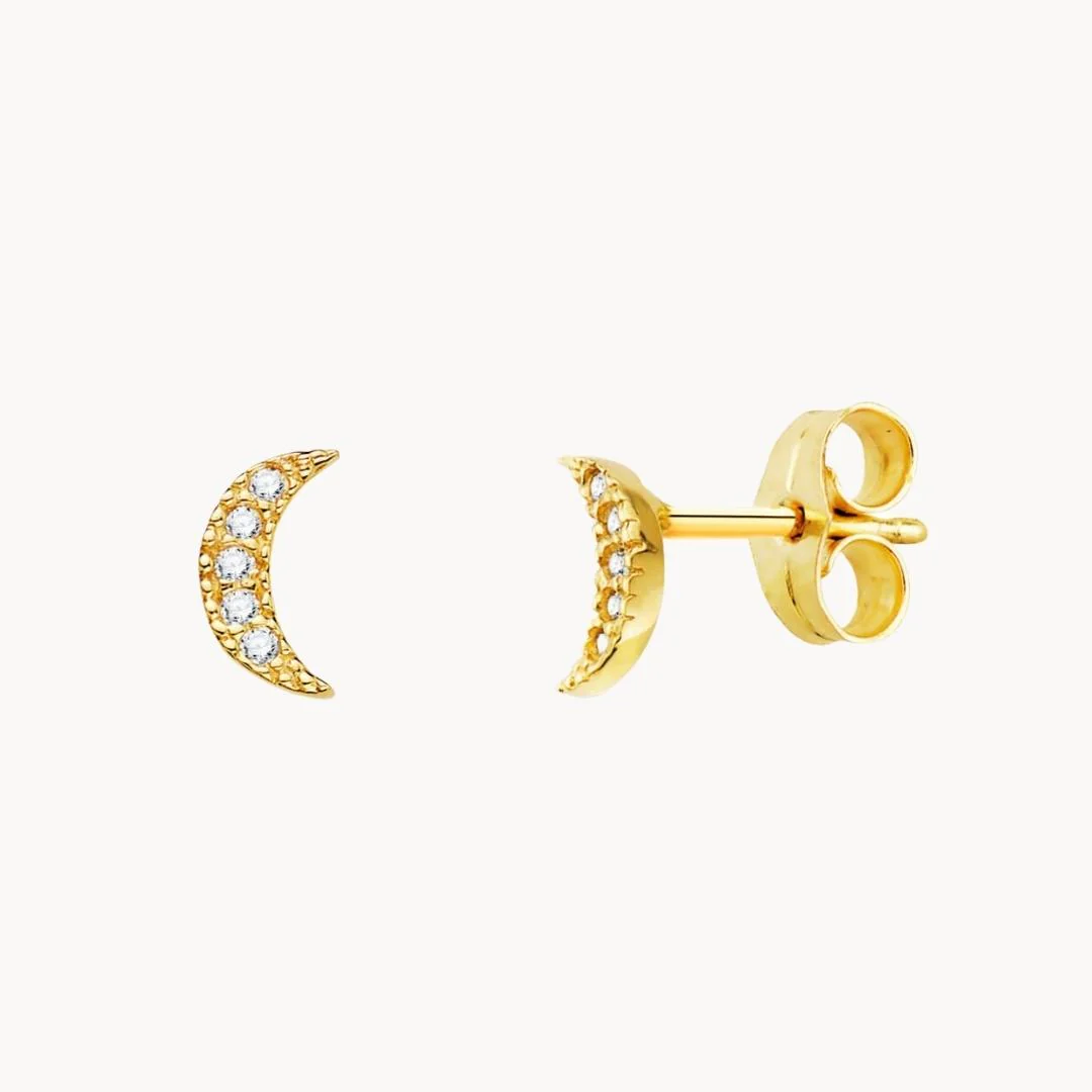 Pendientes de oro amarillo de 9 kilates luna con diez diamantes naturales en talla brillante de 0.005 quilates en total. Con estos pendientes se adjunta un certificado que acredita la pureza, color, talla y peso de los diamantes.