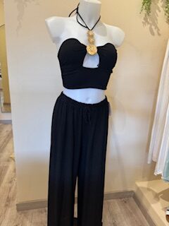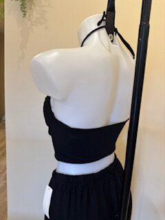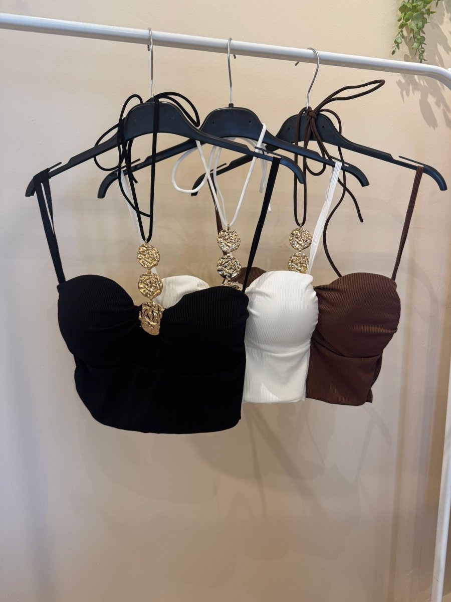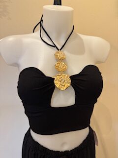 Top con forma de corazón en el busto para realzar el escote con abertura en el centro del pecho combinado con collar dorado de diseño. Talla única pero bastante elástico.