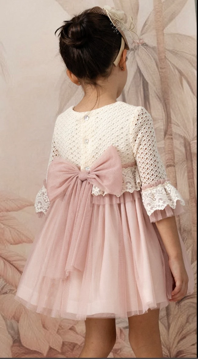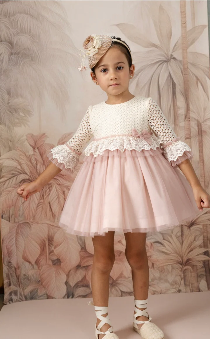 Este elegante vestido infantil destaca por su delicada combinación de texturas y tonos pasteles, ideal para ceremonias o eventos especiales.