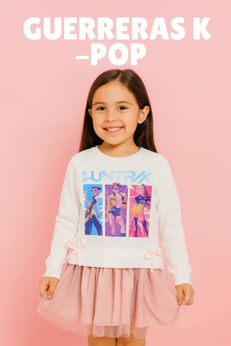 Este original vestido es una mezcla perfecta de comodidad y estilo escénico, ideal para un concepto de moda infantil inspirado en el grupo Huntrix.