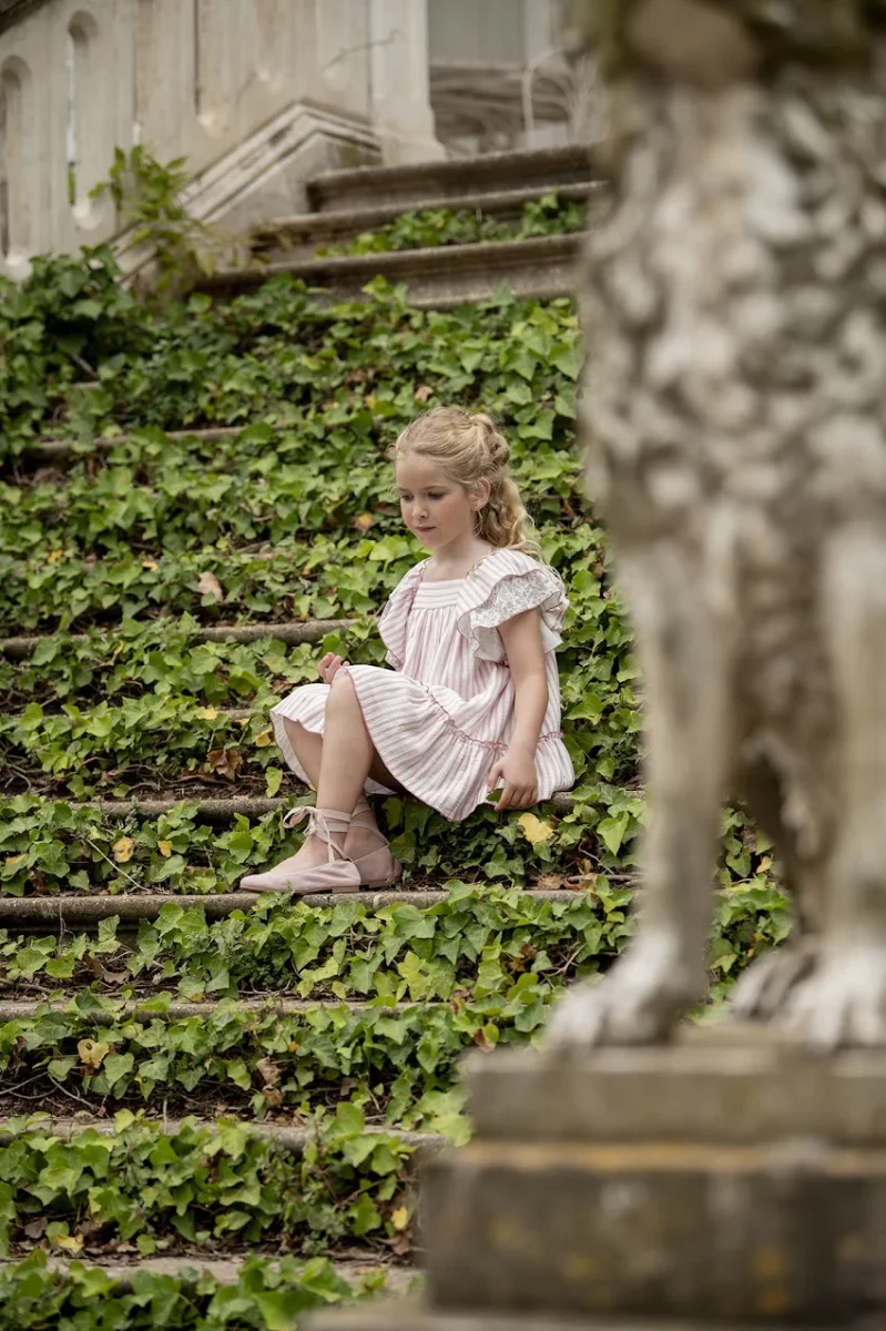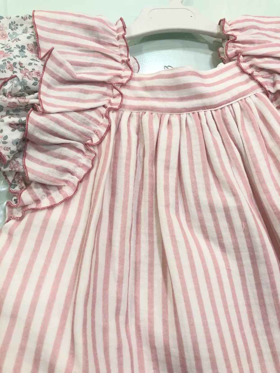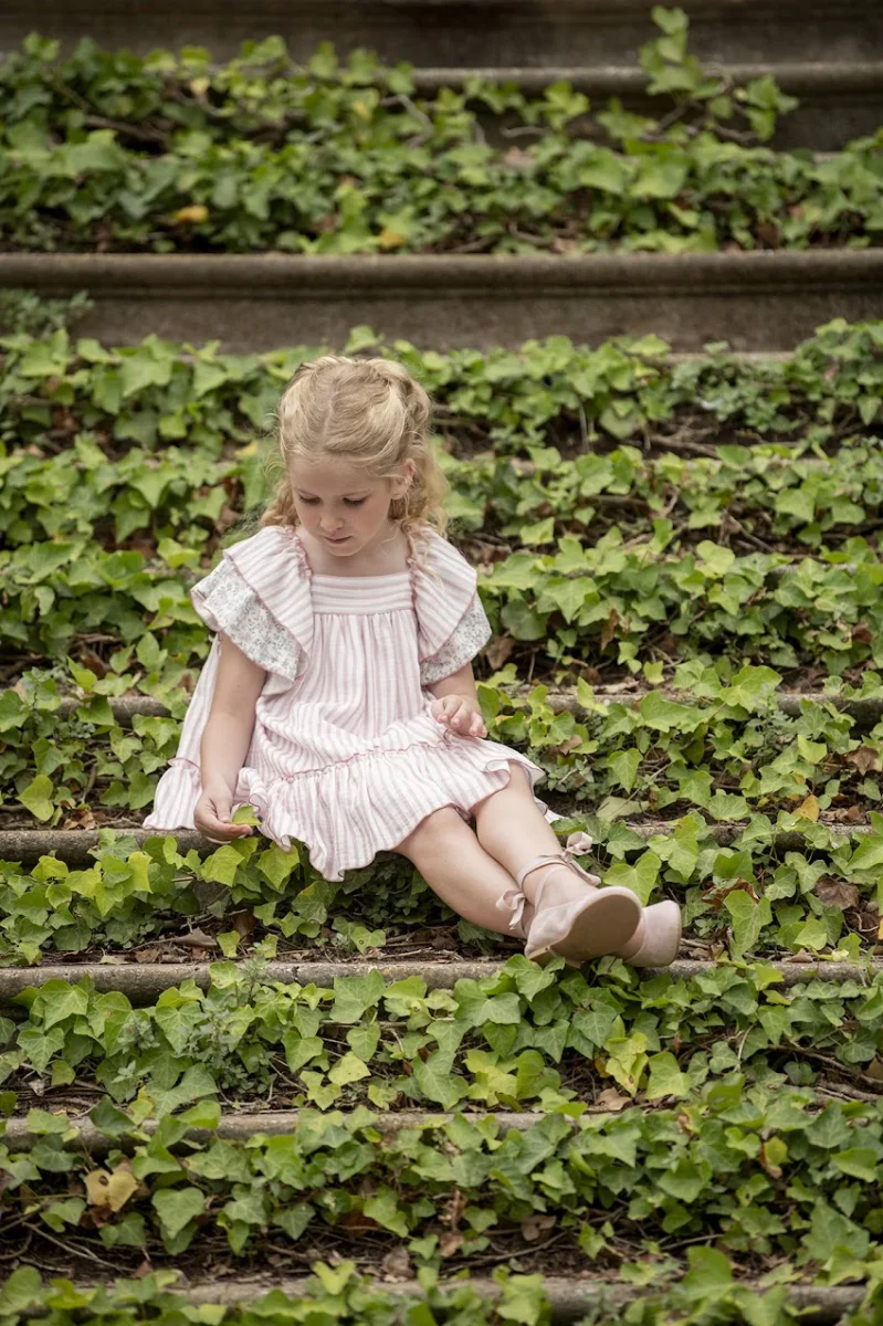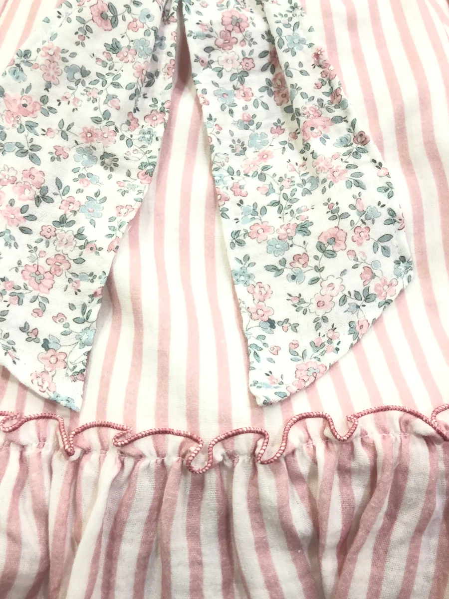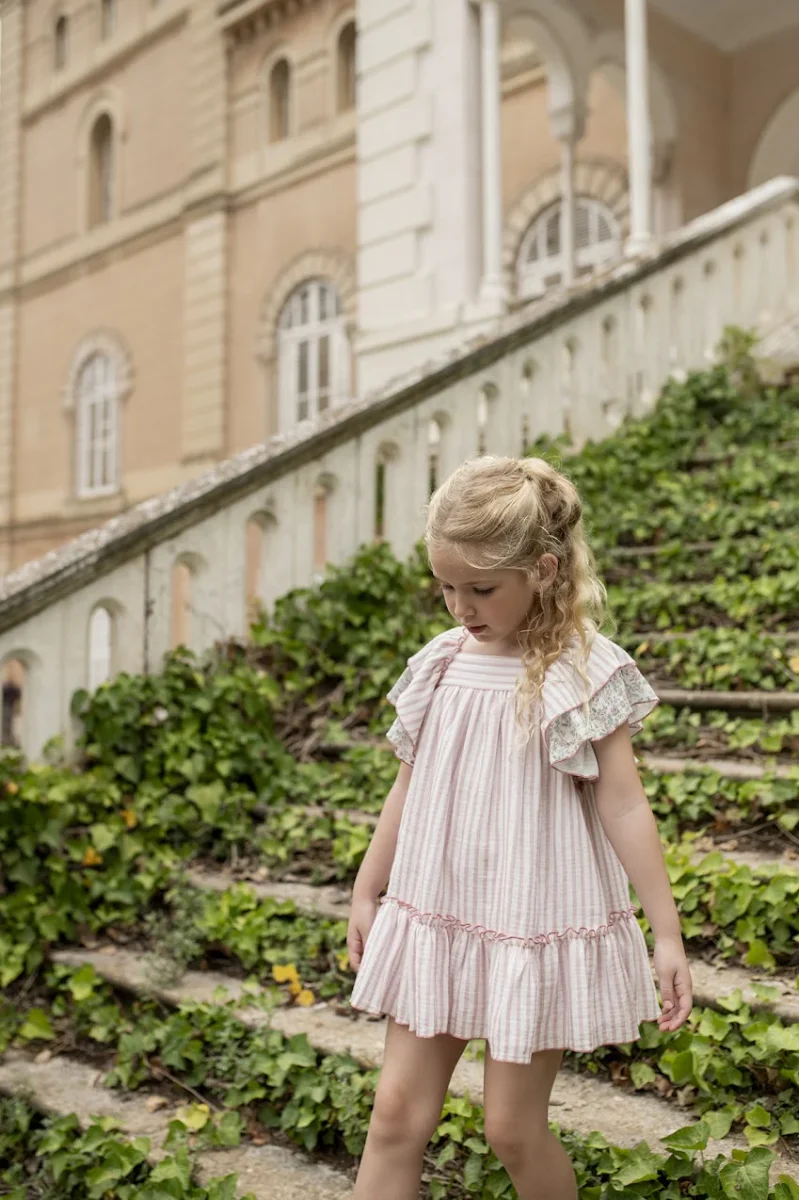Vestido de niña en rayas en color rosa nude, Con dos volantes en las mangas, uno de rayas y otro con estampación de flores verdes y rosas, y dispone de un gran volante en todo el bajo. En la parte de atrás del vestido luce lazo estampado de flores.