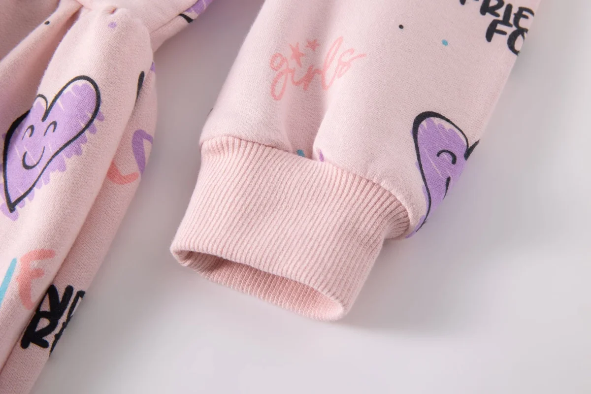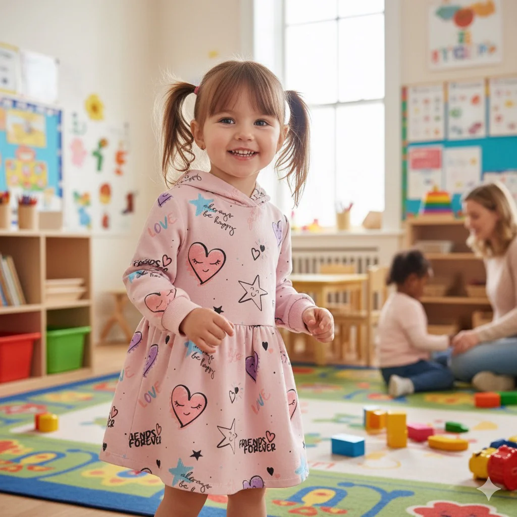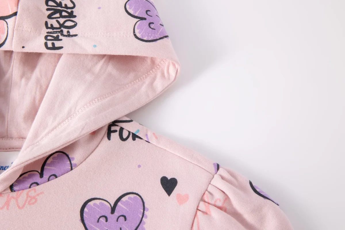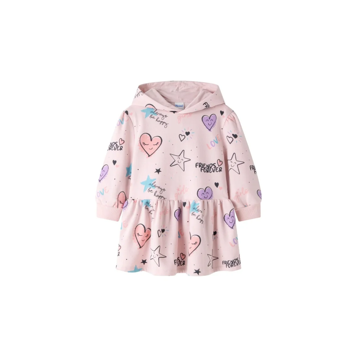 Vestido de niña con capucha de invierno, es de felpa de algodón de rizo. Hombros caídos con frunce, manga ancha y puño de rib. Corte en la cadera con falda de vuelo con pliegues. Estampado de graffiti con corazones y estrellas.